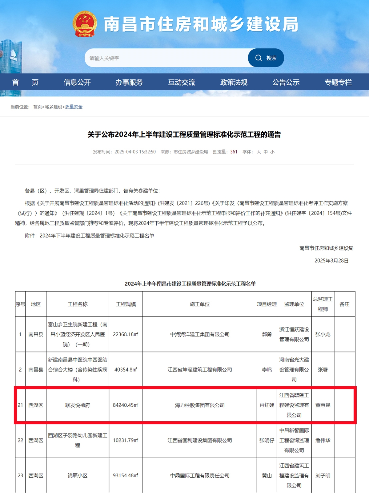 近日,南昌市住房和城乡建设局发布《关于公布2024年上半年建设工程质量管理标准化示范工程的通告》,海力控股集团承建的联发悦禧府项目获评"2024年上半年南昌市建设工程质量管理标准化示范工程"。