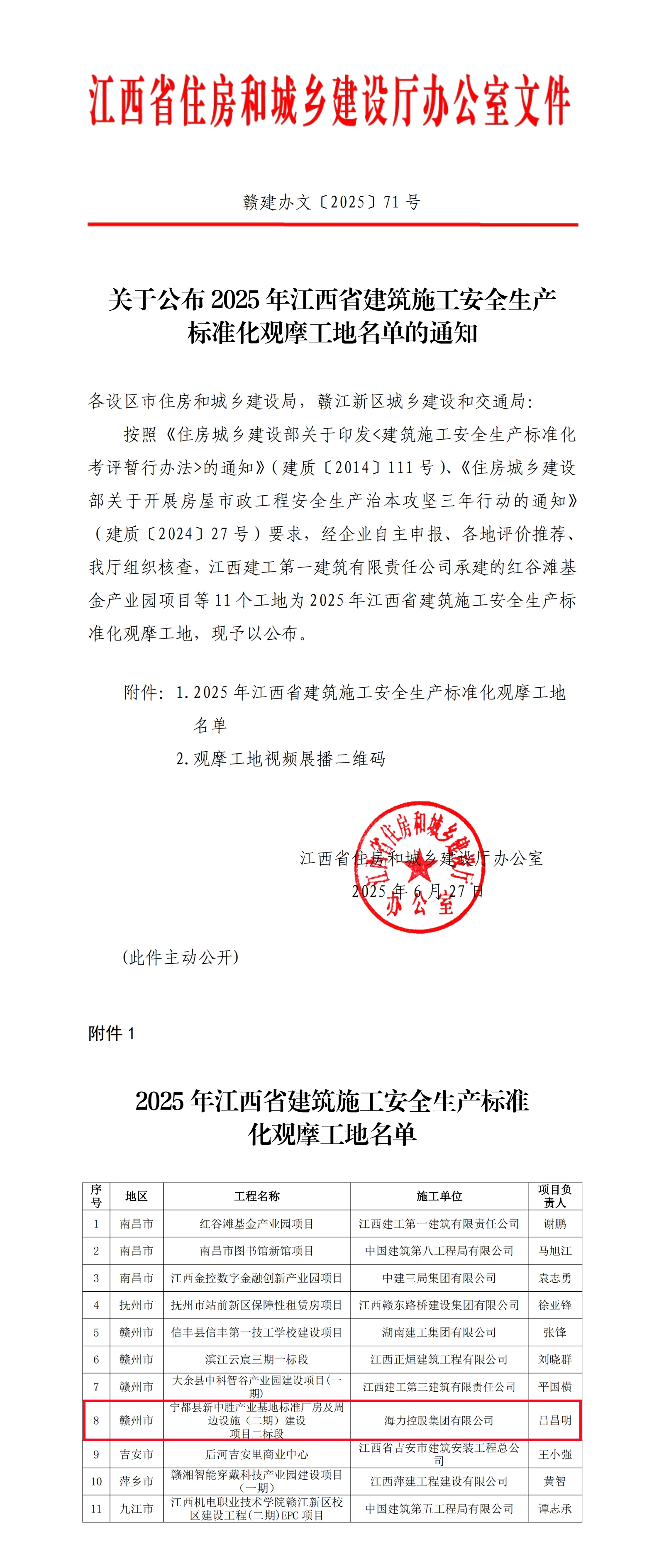 近日,由江西省住房和城乡建设厅主办的“全省房屋市政工程安全生产治本攻坚三年行动推进会暨安全生产标准化工地现场观摩会”在南昌召开。海力控股集团承建的宁都县新中胜产业基地标准厂房及周边设施(二期)建设二标段项目入选2025年江西省建筑施工安全生产标准化观摩工地名单,以标准化管理、科技化应用与系统化防控的创新实践,为行业安全生产树立标杆。